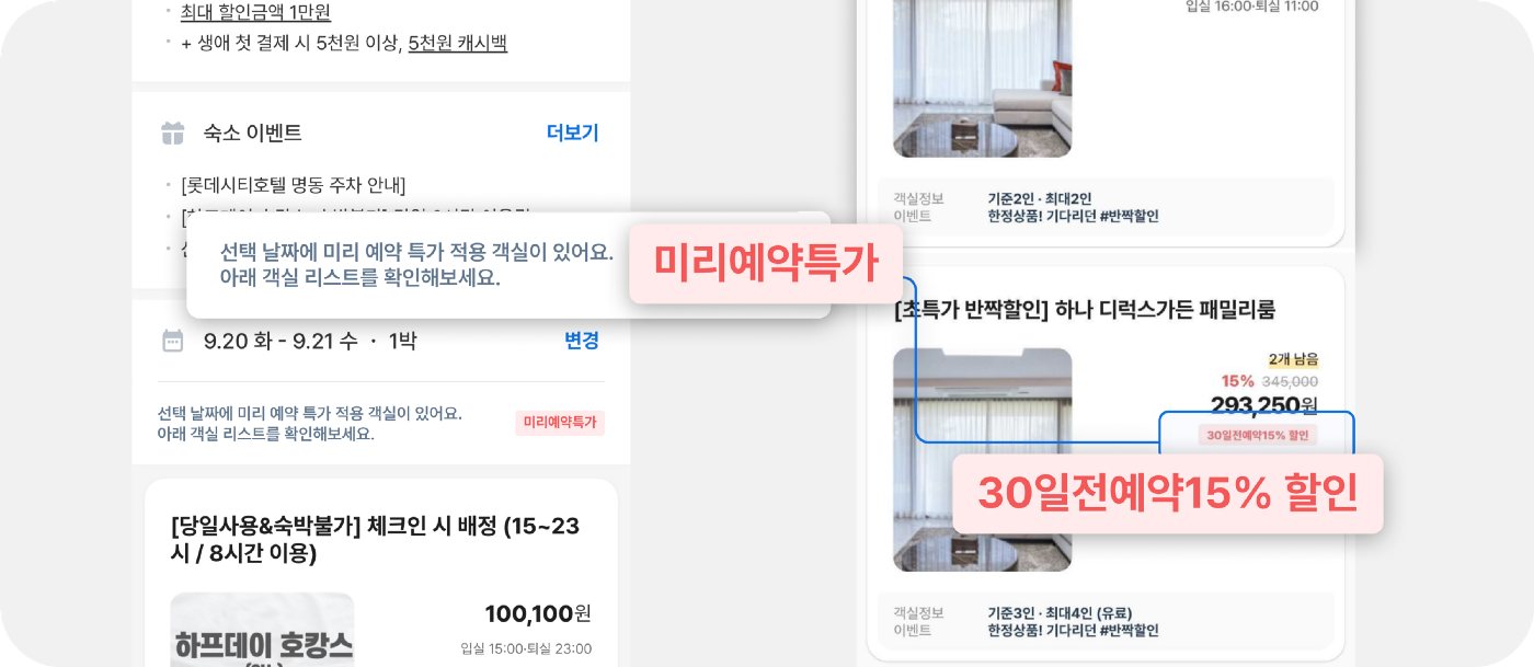이미 미리예약 특가기간의 혜택을 받을 수 있는 사용자이므로 객실 아이템 카드에서 할인・혜택을 확인할 수 있다는 문구를 추가한다.