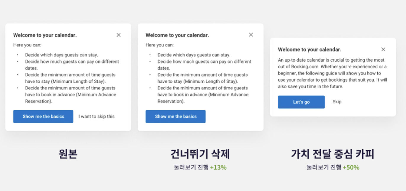 해외 숙박예약 사이트인 부킹 닷컴을 살펴보겠습니다. 연간 2만 5천 개가 넘는 AB 테스트를 한다고 하는데, 숙박 업소주의 사용자의 테스트 예시는 아래와 같습니다. 숙소를 등록하려고 가입한 숙박 업소주가 첫 3개월동안 크게 이탈하는 데이터를 확인하여 제품을 설명하는 둘러보기 단계에서 건너뛰는 선택지를 고른다는 것을 알게됩니다. 제품을 설명하는 것도 중요하지만, 제품이 고객에게 어떤 가치를 제공하는 지를 설명하는 것이 더 중요함을 알게 된 테스트 입니다.
