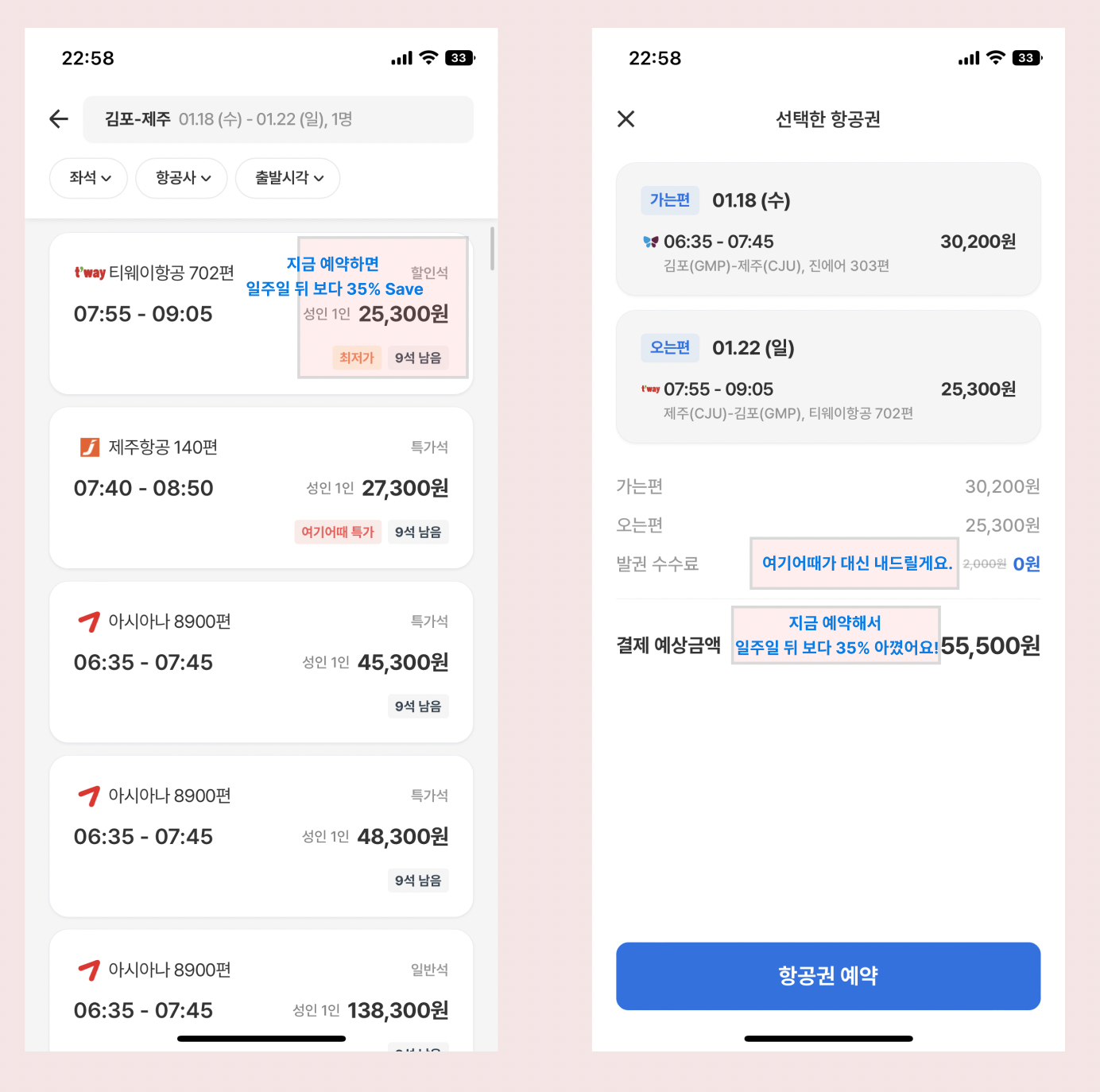 최저가 보상 해외 숙박을 예매한 이용자는 보다 가격에 민감한 이용자 일 것으로 가정하고, 더욱 가격 혜택이 있는 항공권이라면 숙박과 같이 항공도 빠르게 예매하는 테스트를 진행해 볼 수 있겠습니다. 이는 항공 가격의 할인율과 예매일자의 상관관계를 확인하고자 하는 테스트 입니다. 가격 혜택이 있다면, 보다 빠르게 예매 결정을 내리는지 알 수 있습니다. 긍정적인 상관관계가 있다면, 해외 숙박 예매전부터 항공 예매 가격 혜택을 강조하는 정보를 보다 빠른 단계에서 부터 보여줍니다. 그래서 장바구니에 숙박을 담고, 추후에 항공편과 같이 1번에 결제 할 수 있어 간편함과 빠른 예매를 도울 수 있습니다.