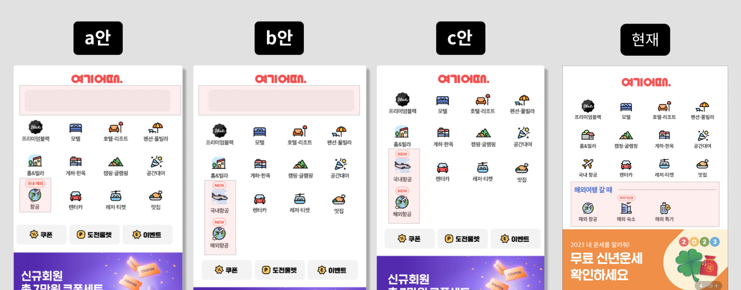 항공 서비스는 서비스 론칭부터 A/B 테스트를 진행했습니다. 항공팀의 첫 A/B 테스트는 ‘여기어때 메인 홈에서 항공 서비스를 어떤 형태로 노출할까?’라는 과제에서 시작했습니다. 여러 테스트를 거쳐 현재는 해외여행 파트를 분리해서 노출했고 보다 성공적으로 신규 서비스 인식을 재고 시켰습니다.